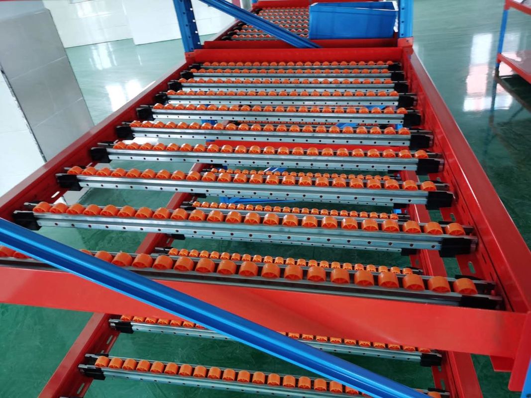 Os carris de fluxo são fixados num espaço de engrenagem, permitindo que a palete seja colocada na extremidade superior do rack e desligue até ao extremo de descarga.
